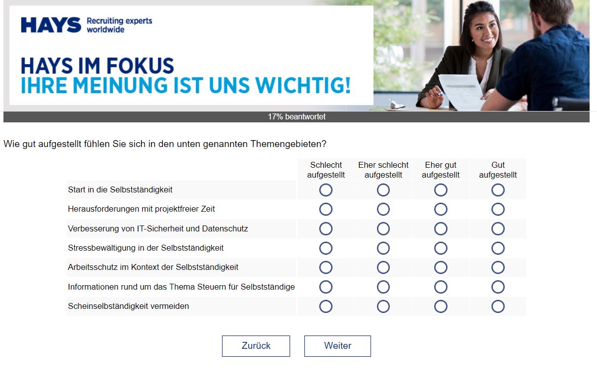 Vor einigen Wochen haben wir deshalb im Rahmen einer großen Hays-Umfrage gezieltes Feedback zum Thema neue Produkte im Bereich Compliant Sourcing eingeholt und wollten von Ihnen wissen, welche Produkte und Inhalte zum Thema Fremdpersonaleinsatz für Sie zusätzlich zu unserem bestehenden Leistungsportfolio besonders interessant sind.