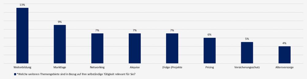 In der Grafik wird deutlich, dass die Bandbreite der Themen sehr vielfältig ist. Vor allem das Thema Weiterbildung sowie Informationen rund um die aktuelle Marktlage sind für die Befragten von größerer Relevanz, dicht gefolgt von Networking, Akquise und (Folge-)Projekten.