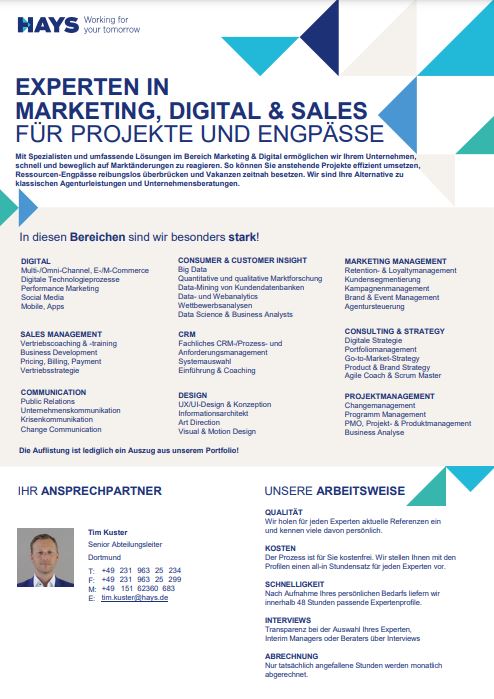 Sowohl Ihre Ansprechpartner bei Hays als auch die Interim-Expertinnen und -Experten in unserem Netzwerk sind spezialisiert auf ein Fachgebiet und die jeweilige Branche. Unsere langjährige Erfahrung basiert auf der Besetzung von Tausenden Projekten und Positionen im Bereich Marketing & Digital. Sprechen Sie auf Augenhöhe mit einem Partner, der Ihre Anforderungen und Spezifika versteht und weiß, worauf es bei der Vermittlung von Externen ankommt.
